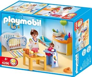 Play-Original - La boutique des playmobil : occasions, neufs, accessoires, playmobils de collection, anciens, rares et originaux. Garderie répartie sur deux niveaux. Maman avec bébé et table à langer playmobil.