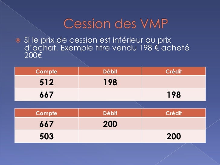 Si la cession dégage une plus-value, on utilise un compte de produit 7"Produits nets sur cession de VMP ". Cession de valeurs mobilières de placement. La cession des valeurs mobilières de placement VMP.